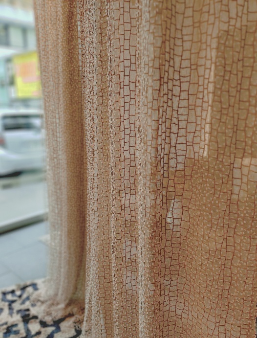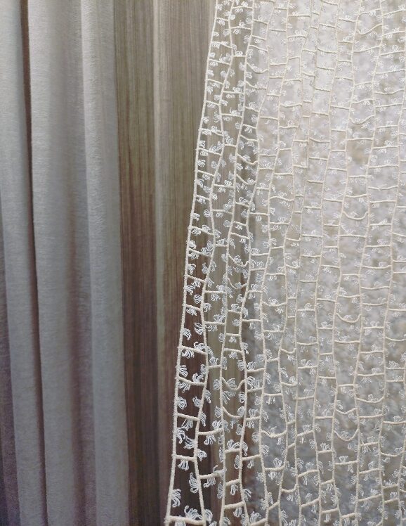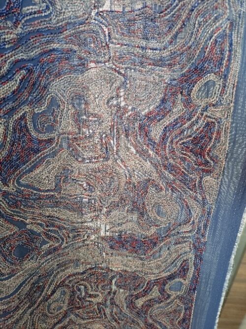 ソウタシエ刺繍が全体に施されたドレープ生地。糸の繊細なカラー・グラデーションは特殊な染色技術によって生み出され、1メートルごとに個性が生まれます。