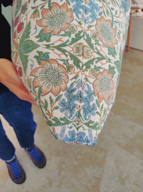 MAY’S COVERLETはメイ・モリスがエメリー・ウォーカーの妻のために制作したクルエール刺繍のベッドカバーのデザインがもとになった生地だそうです。