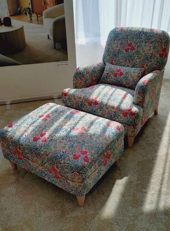 また、カタログ内の一部のモリス生地は椅子張りにも対応しております。 カーテンココでは、お好みのカーテン生地での椅子張りのご相談も承っております。 左の写真のデザインの椅子はメーカーにて作成も可能です。 モリスの生地の椅子とオットマンはとても可愛くて椅子に掛けて寛ぐのが楽しくなりそうですね。 |