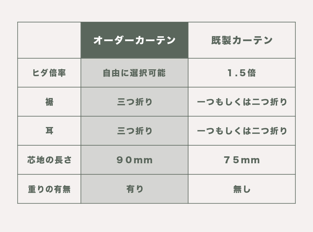 オーダーカーテンと既製カーテンの最大の違いは、サイズやデザインの自由度です。