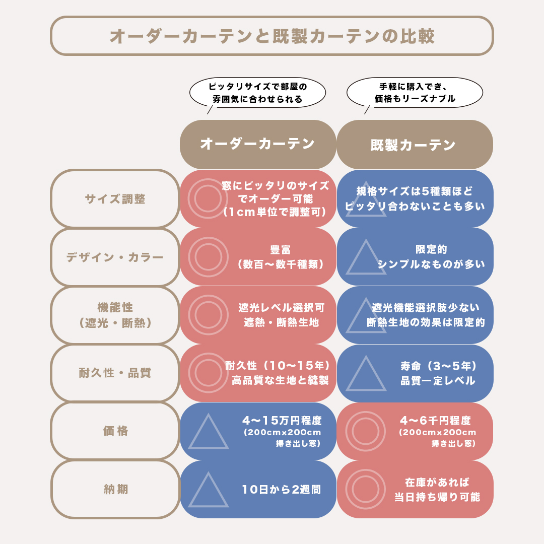・既製品用のカーテン素材をオーダーサイズで仕立てる場合はクオリティに満足できない場合がある。