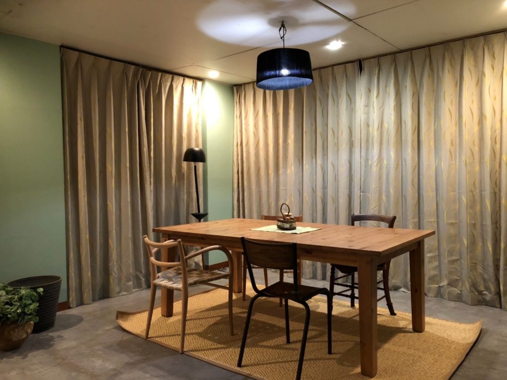 とわ子の自宅のリビングダイニングのカーテンは明るくナチュラルテイストのご希望を頂きました。
