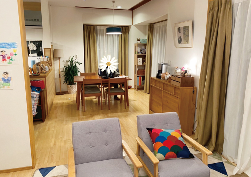 リビングのカーテンは、パステルトーンの花柄が女性らしいデザインです