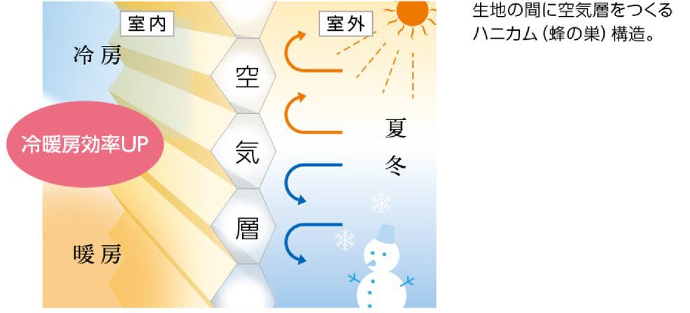 ハニカム(蜂の巣)構造の生地が作る空気層により、冷暖房効率を向上し省エネに貢献します。