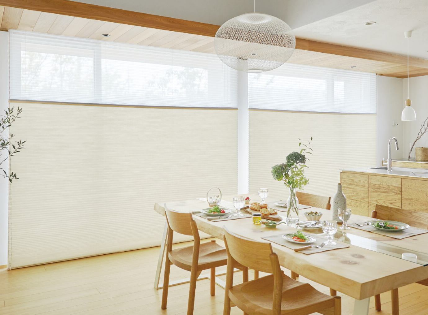 夏は外からの暑い日差しを前後二枚の生地で遮り、冬は室内の暖かさをハニカム内の空気層が外に逃がさないように守ります。