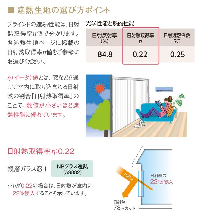 アカリナリフレクトは、窓を通して室内側に放出される熱量「日射熱取得率」が0.19ηA(イータ エー)。これは数値が低いほど室内の温度上昇を防ぎ、室温を一定に保とうとするエアコンの負荷を抑えることに繋がります。