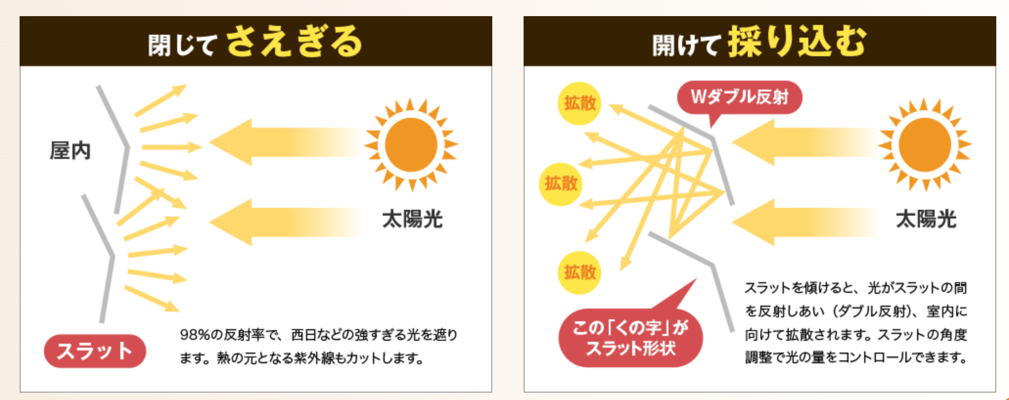 またスラットの角度調整で光の量もコントロールできます。