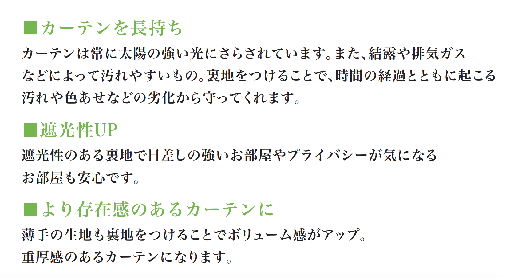 カーテンは常に太陽の強い光にさらされています。また、結露や排気ガスなどによって汚れやすいものです。裏地をつけることで、時間の経過とともに起こる汚れや色あせなどの劣化から守ってくれます。