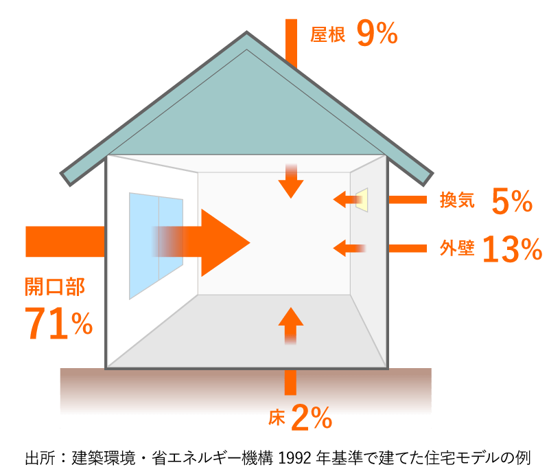 一般的な住宅をモデルにした試算により、外気熱の侵入経路の実に約70%が窓から入ってくることが分かっています。