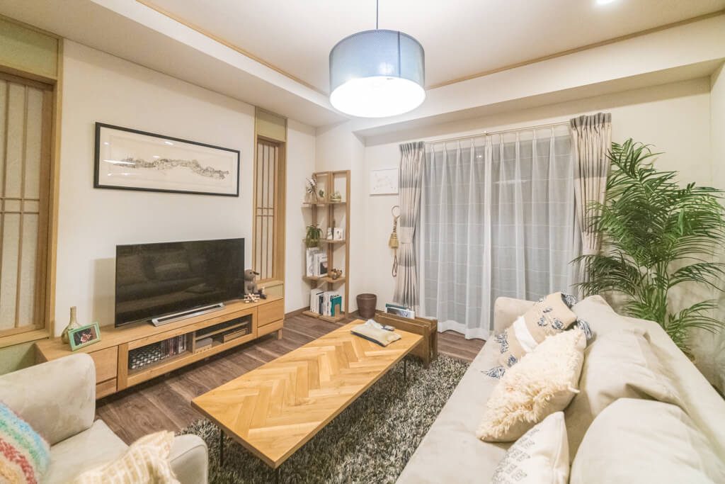 リビング・ダイニングは隣接する和室とも調和するように、今人気のあるグレイッシュなお色からアイボリーに変化するグラデーションボーダーのデザインで、ナチュラルで穏やかな風合いのドレープをコーディネートしました。