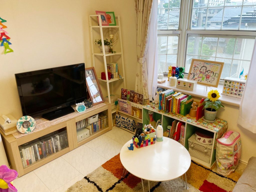 居間は色味は全体と調和して主張し過ぎないオフホワイトベースに。
