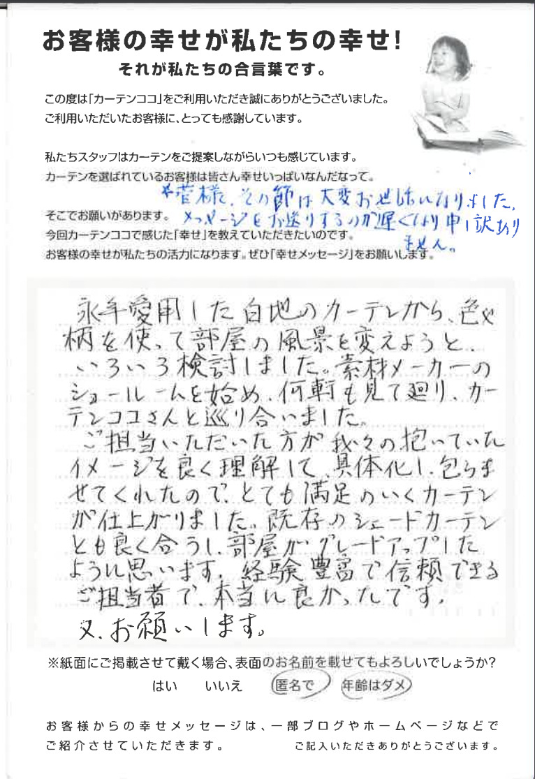 オーダーカーテンを購入したお客様よりいただいた、ご感想ハガキをご紹介します。
