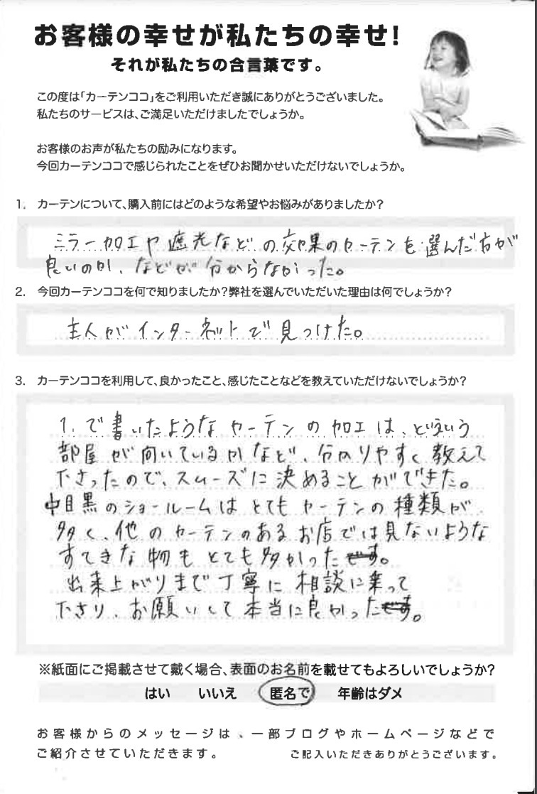 オーダーカーテンを購入したお客様よりいただいた、ご感想ハガキをご紹介します。
