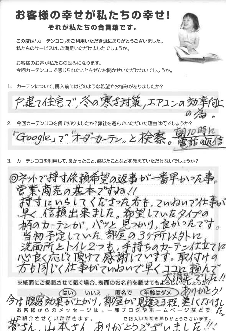 当初予定していた部屋の3ヶ所以外に洗面所とトイレ2つも、手持ちのカーテン仕立てに心良く応じて頂けて感謝しています。取付けの方も同じく仕事がていねいで早くココに頼んで大満足でした!!
