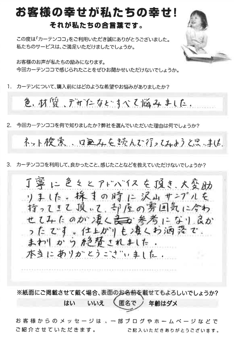 丁寧に色々とアドバイスを頂き、大変助かりました。採寸の時に沢山サンプルを持ってきて頂いて、部屋の雰囲気に合わせてみたのが、凄く参考になり良かったです。