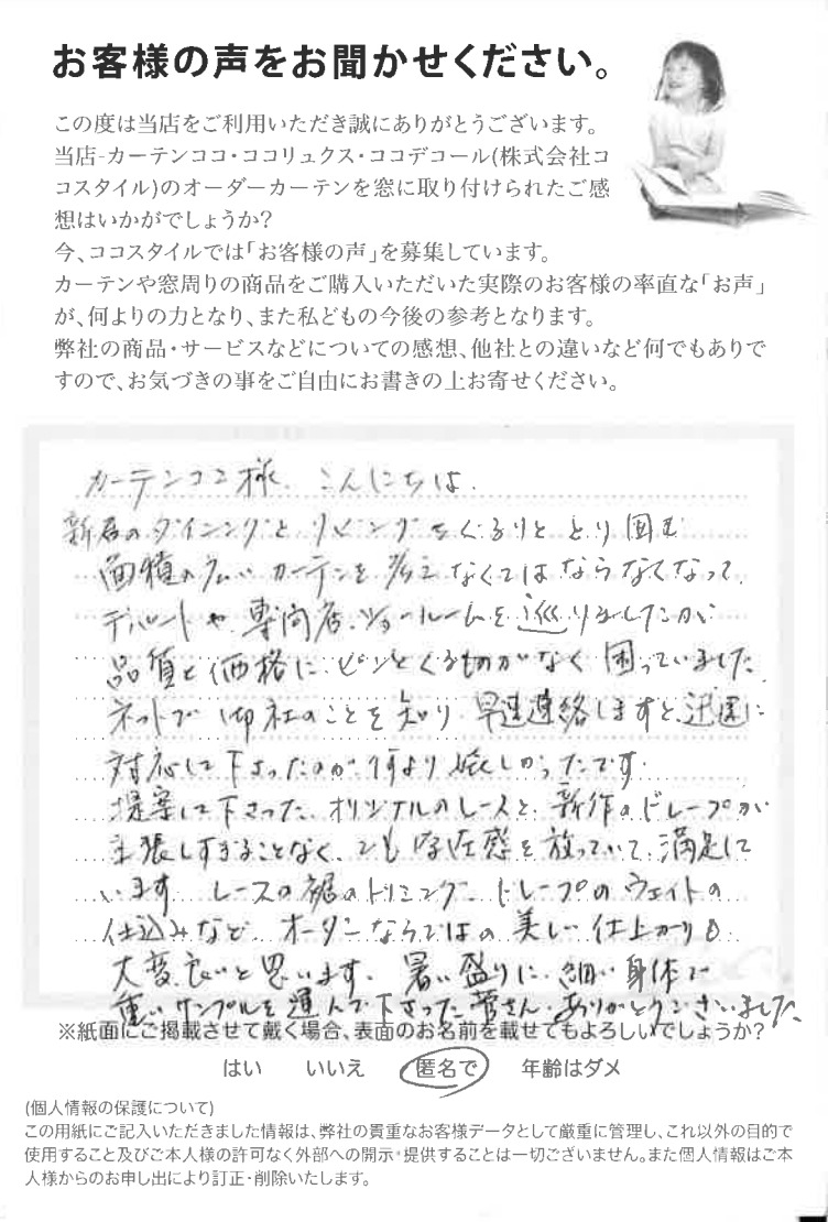 オーダーカーテンを購入したお客様よりいただいた、ご感想ハガキをご紹介します。