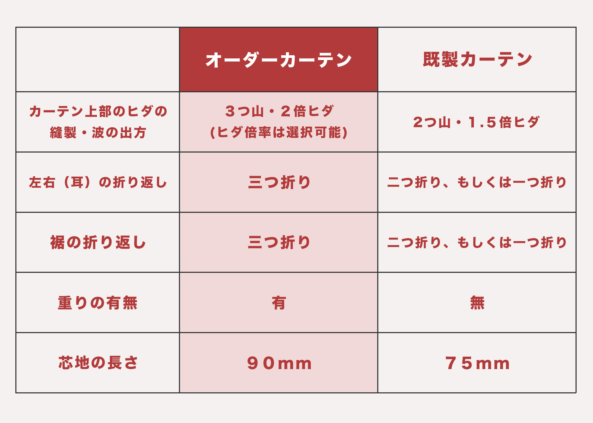 カーテン上部をつまんで山を作っている「ヒダ」の形状や縫製によって、カーテンの波の出方が異なる点が大きな違いです。