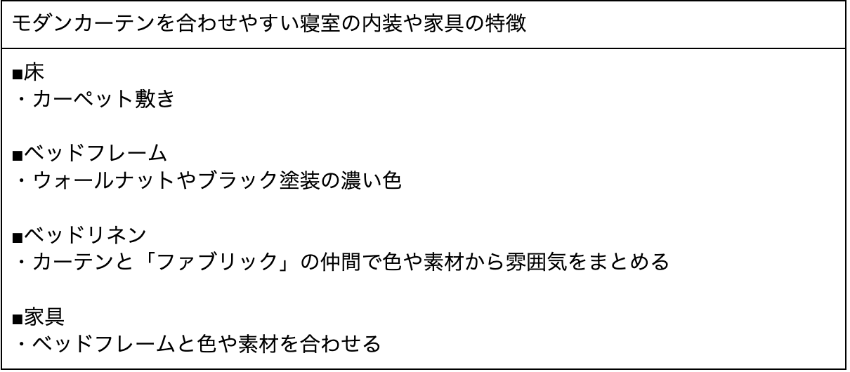 モダンカーテンを合わせやすい寝室の内装や家具の特徴は、以下の通りです。