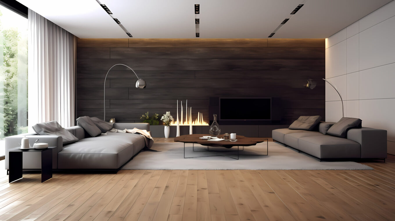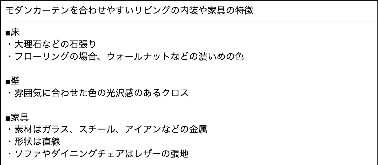 モダンカーテンを合わせやすいリビングの内装や家具の特徴は、以下の通りです。