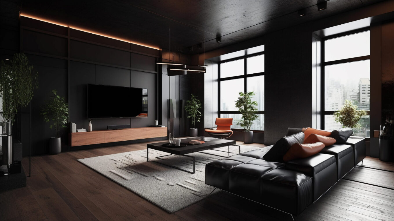 インテリアのカラーは、ブラック・グレー・ホワイト色が多く使用され、木製家具はダークブラウン色などの濃い目の色が使用されます。