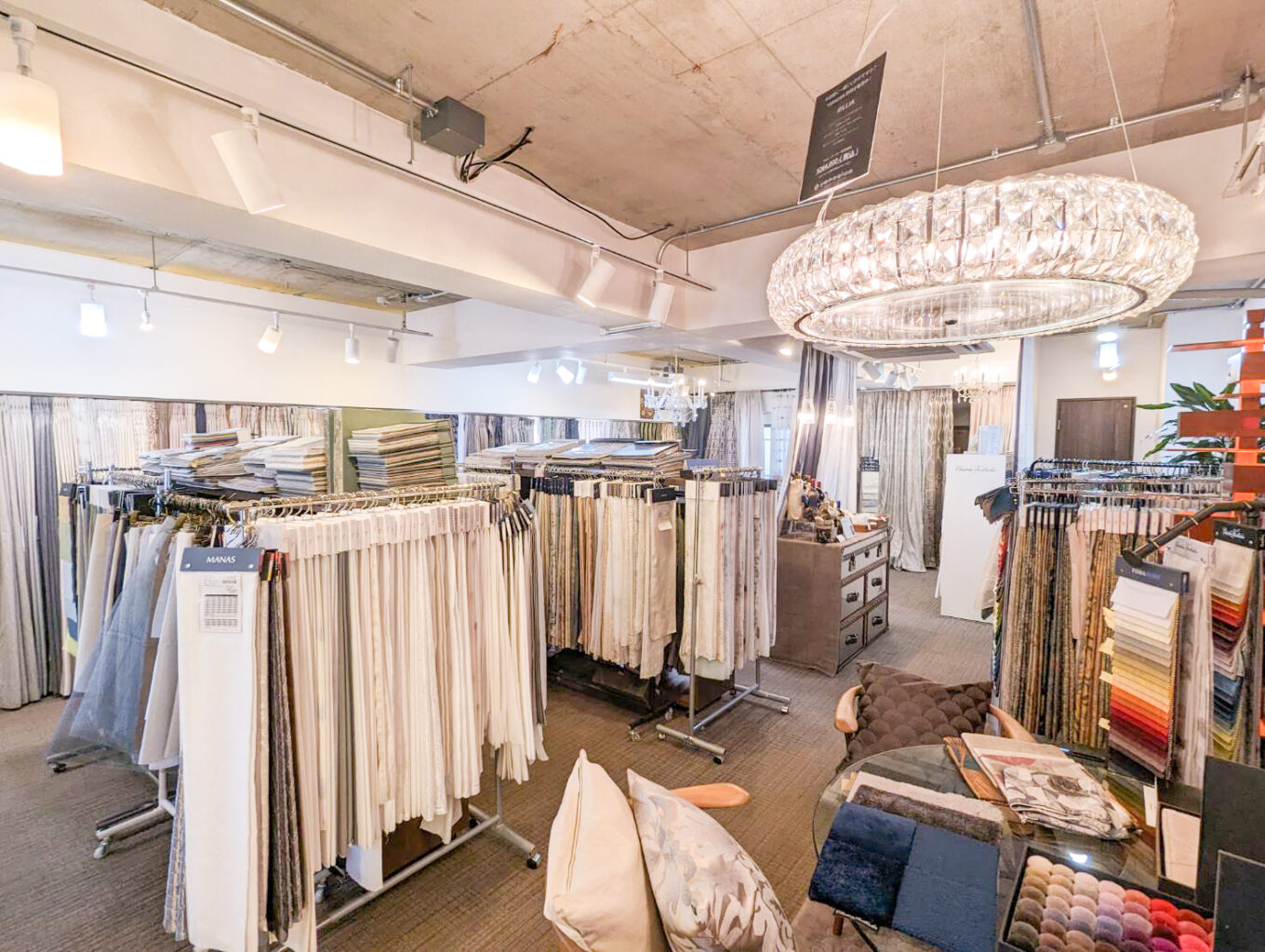 Just a two-minute walk from Nakameguro Station, the showroom is a relaxing, high-quality space where you can directly hold and view fabrics from a variety of domestic and international makers.