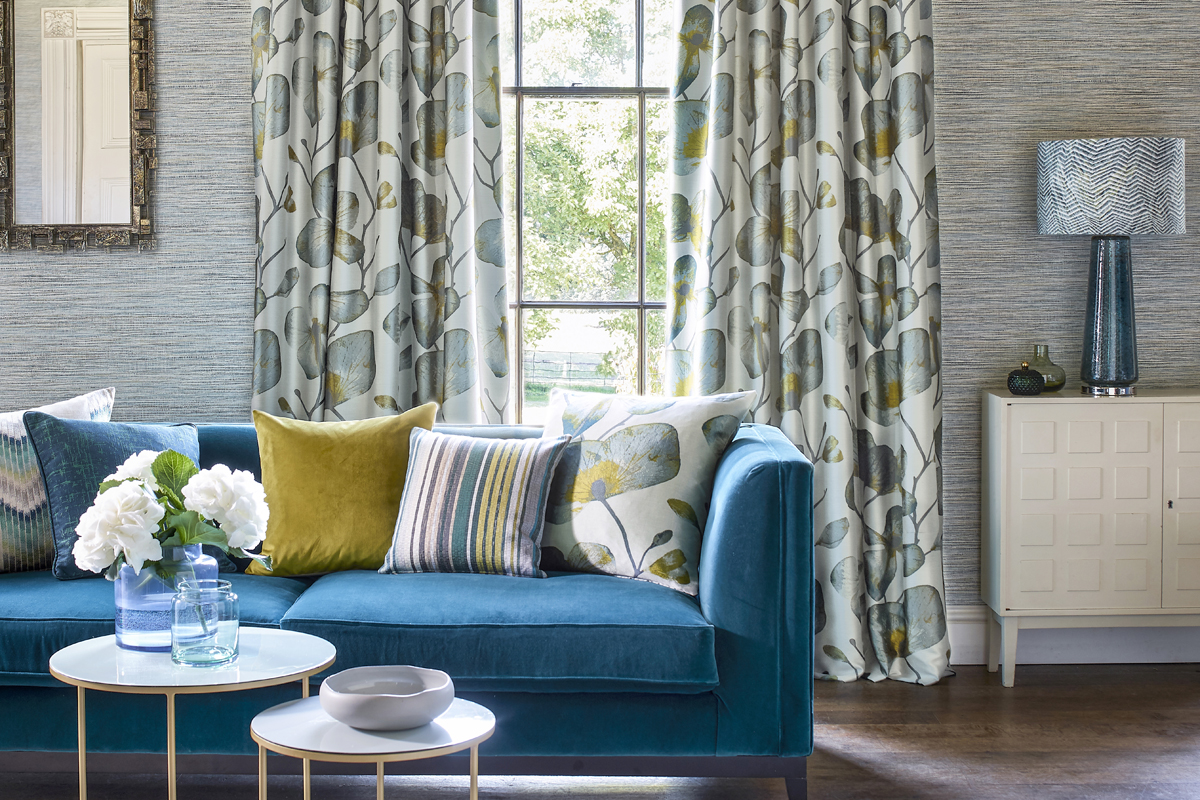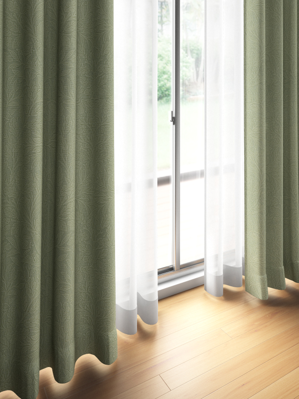 カーテンになると、大胆で美しいデザインが高級感を感じさせると同時に、植物の曲線が柔らかさも演出します。