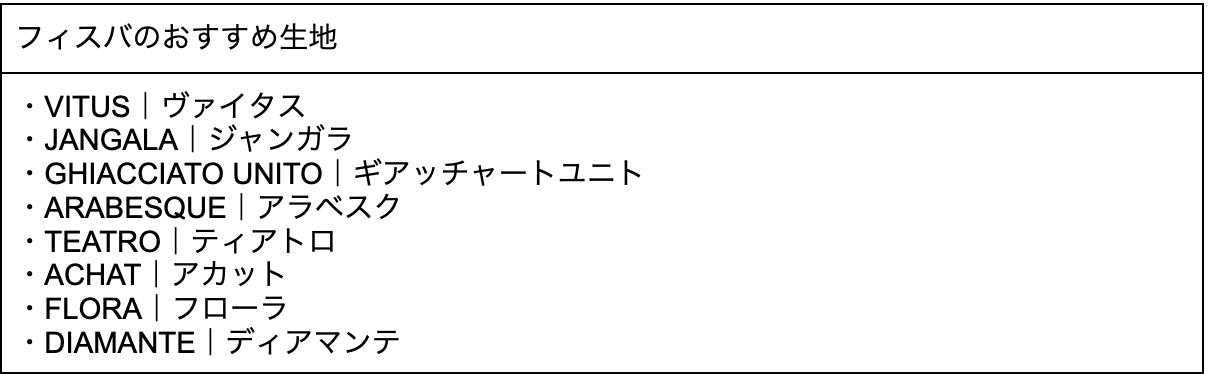 フィスバは、ファッションファブリックを取り扱っていた歴史が長く、その影響が現在も残っており商品製作に反映されています。