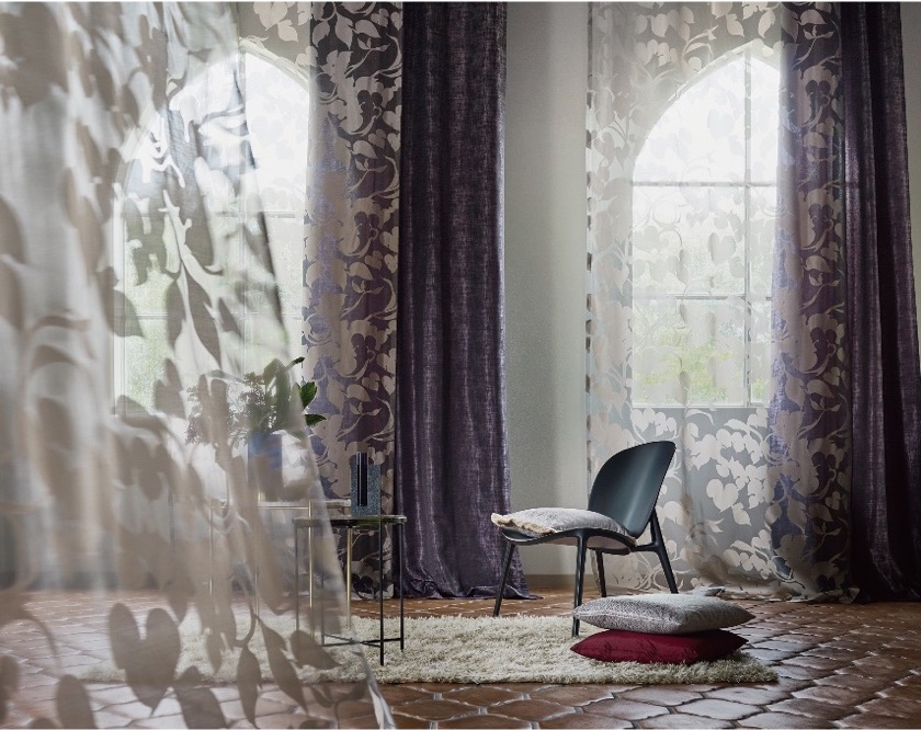 グラマラスな植物柄のシルエットが生地全体を流れるように覆う、優美なトランスペアレンス。バーンナウトプリントの技法で描きだされたモチーフのなめらかな曲線美、アンティークゴールドのメタリックな質感とベースの透け感のコントラストがモダンな印象です。ナノレベルのステンレス微粒子で生地裏をコーティングするスパッタリング加工により、生地本来の繊細な風合いを損なうことなく、遮熱性能とミラー効果をもたせています。写真はフロント使いで、ドレーパリーにFA6900のブラックベリー色を合わせたコンビネーション。深みのあるシックな色合わせに大人のエレガンスが香ります。