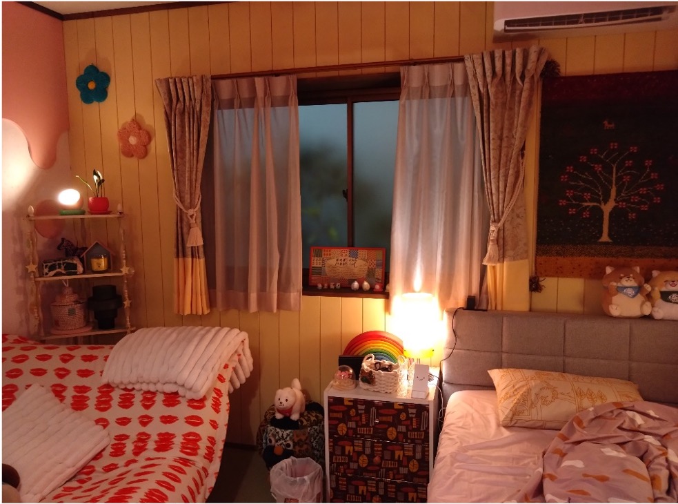 壁紙の色に合わせた黄色のコーディネートです。ポップで可愛らしいお部屋になりました。