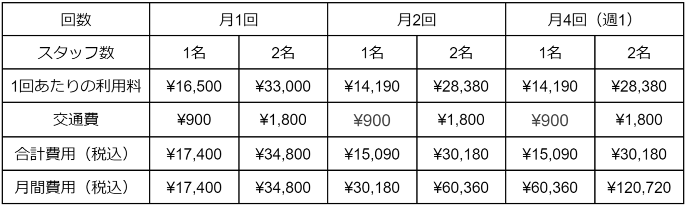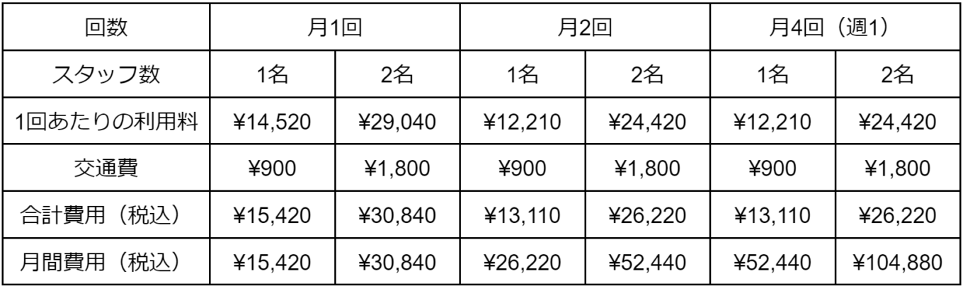 家事代行の利用料金は以下のコース別に決まっています。