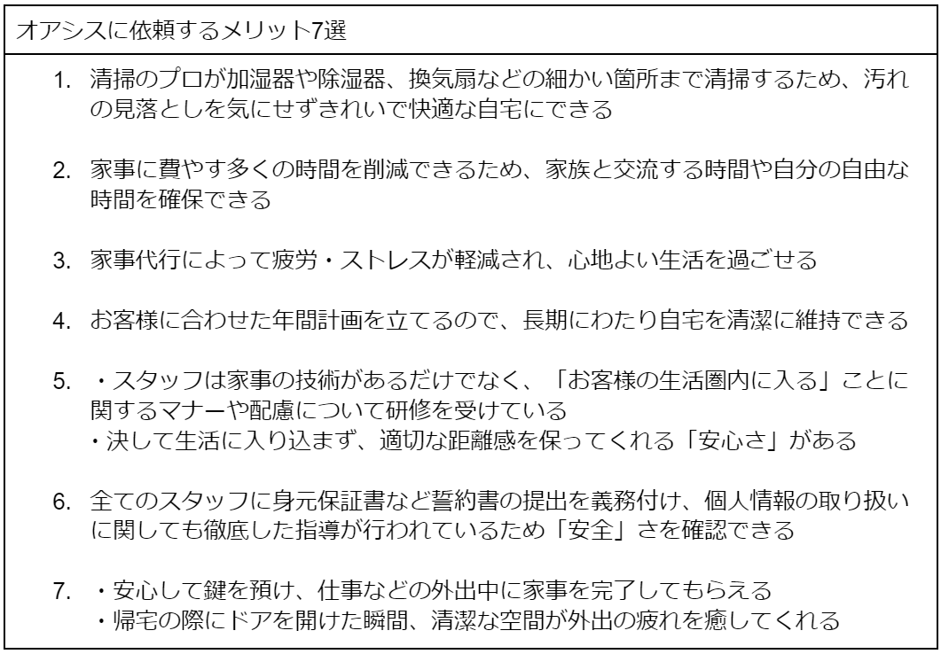 オアシスに家事代行を依頼すると、7つのメリットがあります。