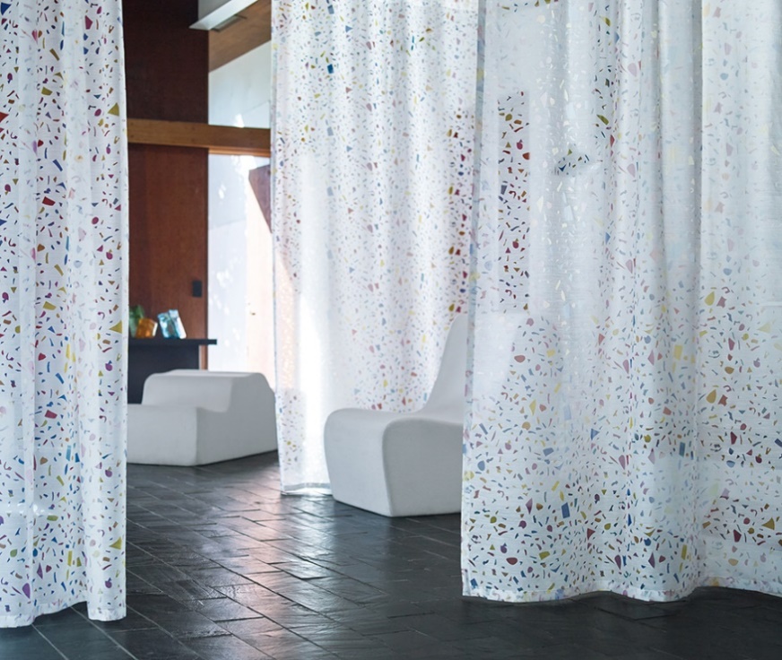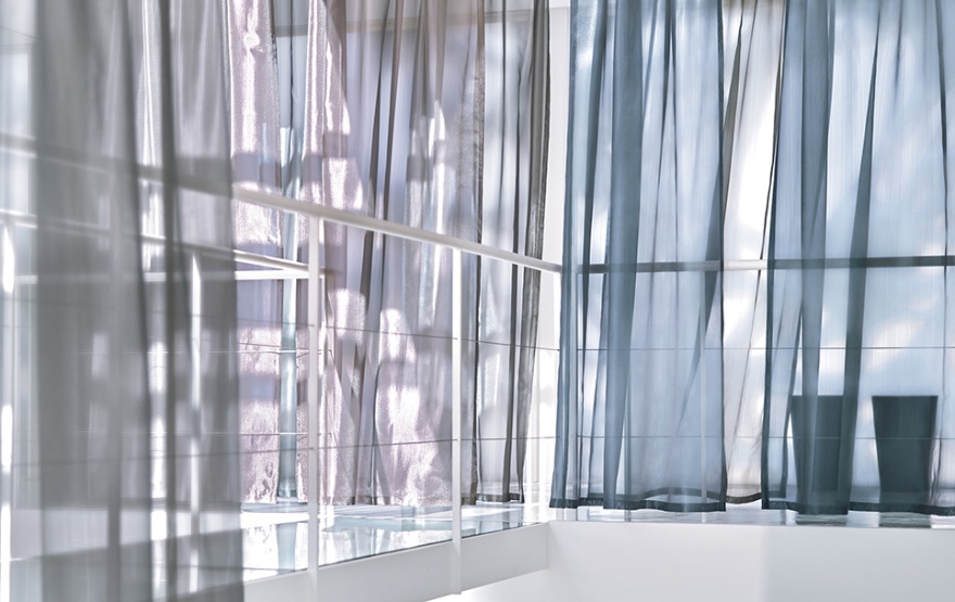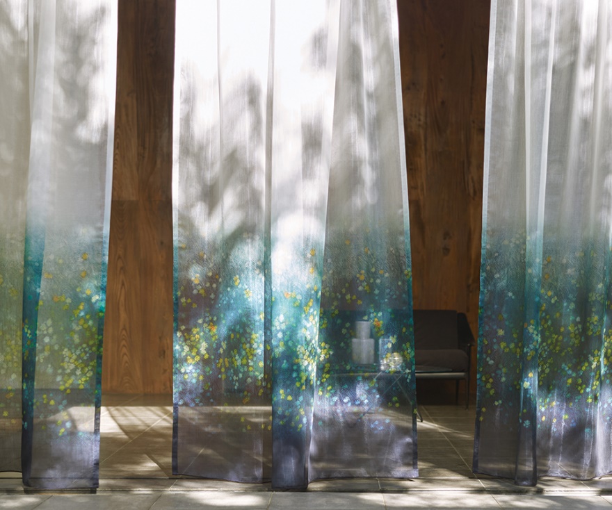 オーガンジーに2種類の金属をスパッタリングしたテキスタイル。見る角度によって玉虫やシャボン玉のように、繊細に色味が変化します。この色味のあるカラースパッタリングという技術をインテリアで使用するのは世界初。従来スパッタリング面は外側を標準としていましたが、今回は室内側を標準とし、本物の金属でありながらも柔らかさと色味を持つ不思議な質感をより感じることができます。機能面でも遮熱の効果があり、商業施設や公共施設等にもお使い頂きたい1枚です。