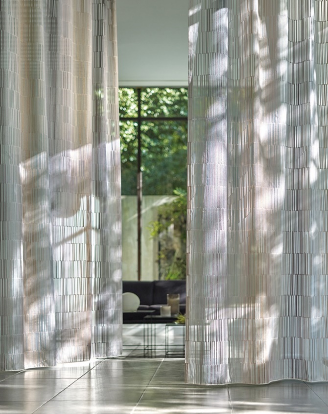 ベルベット調の透けない部分と麻ライクで風通組織の透ける部分が構成されたハーフトランスペアレンスです。3m巾でタテにもヨコにも使用できます。ベルベット調に見える部分は艶のあるモール糸をとゴールドの光沢糸を織り込み、風通部分はモアレが見えます。素材感にこだわった高級感ある質感が特徴です。