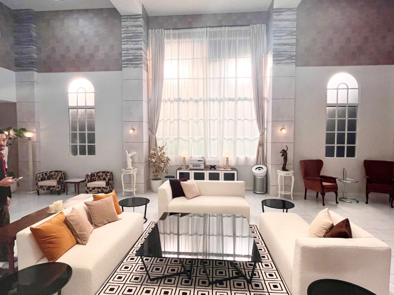 高級感のある大理石のタイル張りの空間に、ジャカード織りでやわらかい質感と光沢感を合わせたニュアンスカラーのカーテンを採用しました。