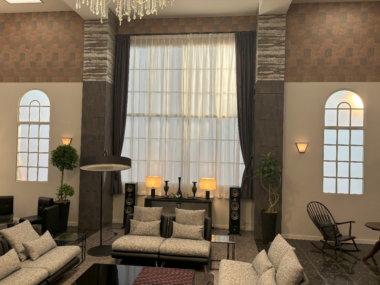 リング糸を使った素材感と柄に使われているブライト糸によって、重厚感がありながらもダークグレーの空間に煌めくカーテンを採用しました。
