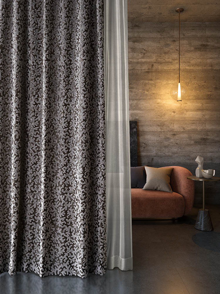 | NEW MIRANDA ミランダ DR101 01 カットベルベットの模様があしらわれた ラグジュアリーなドレープ。フェアでは 03番色のグリーンの模様の生地が展示されています。 ビスコースとポリエステルの混毛です。 |