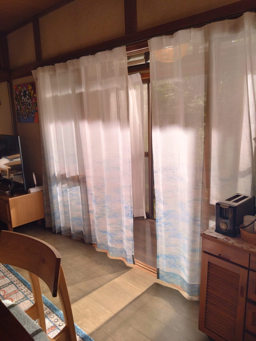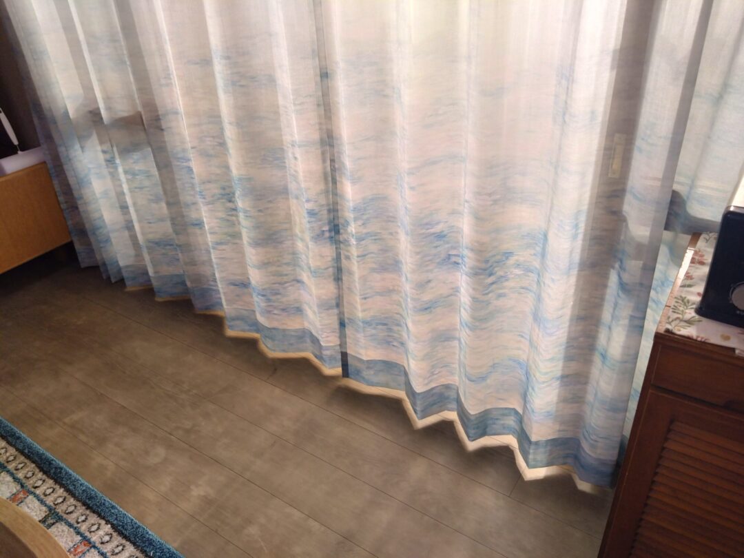 ボトム部分に水面を思わせる風景を水彩タッチで抽象的に描いた透明感のあるシアーカーテンをお納めさせて頂きました。縁側の窓辺を通して柔らかい日差しが差し込んできます。