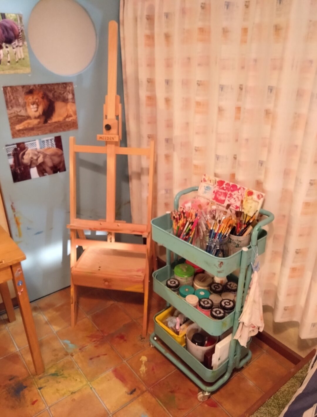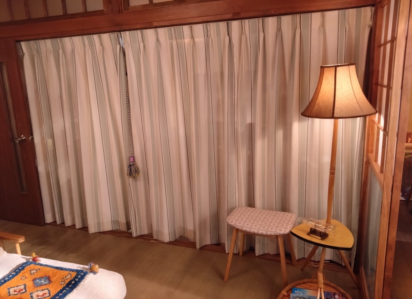 美路人の部屋はナチュラルなスパンボイルレースにピンクとオレンジのスクエア模様のドレープを採用