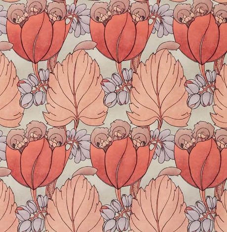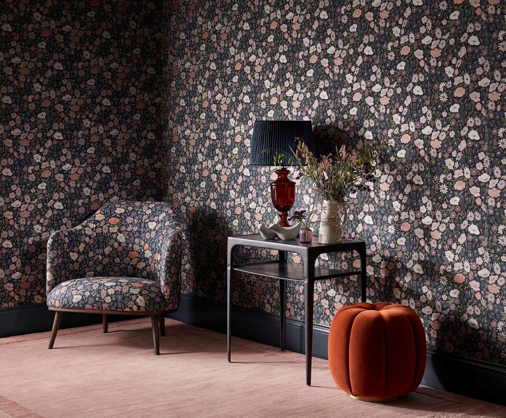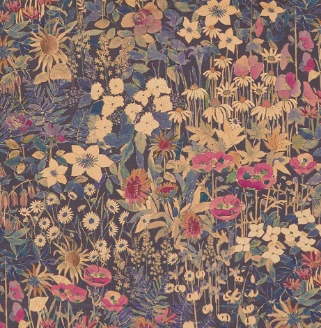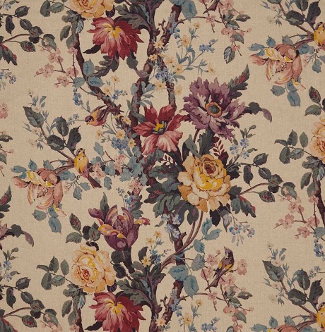 ロンドンのロイヤルチェルシーやハンプトンコートのフラワーショーを見ながら手描きで、デザインされた花柄の美しいベルベット生地です。