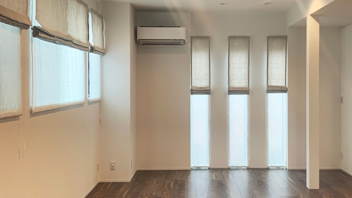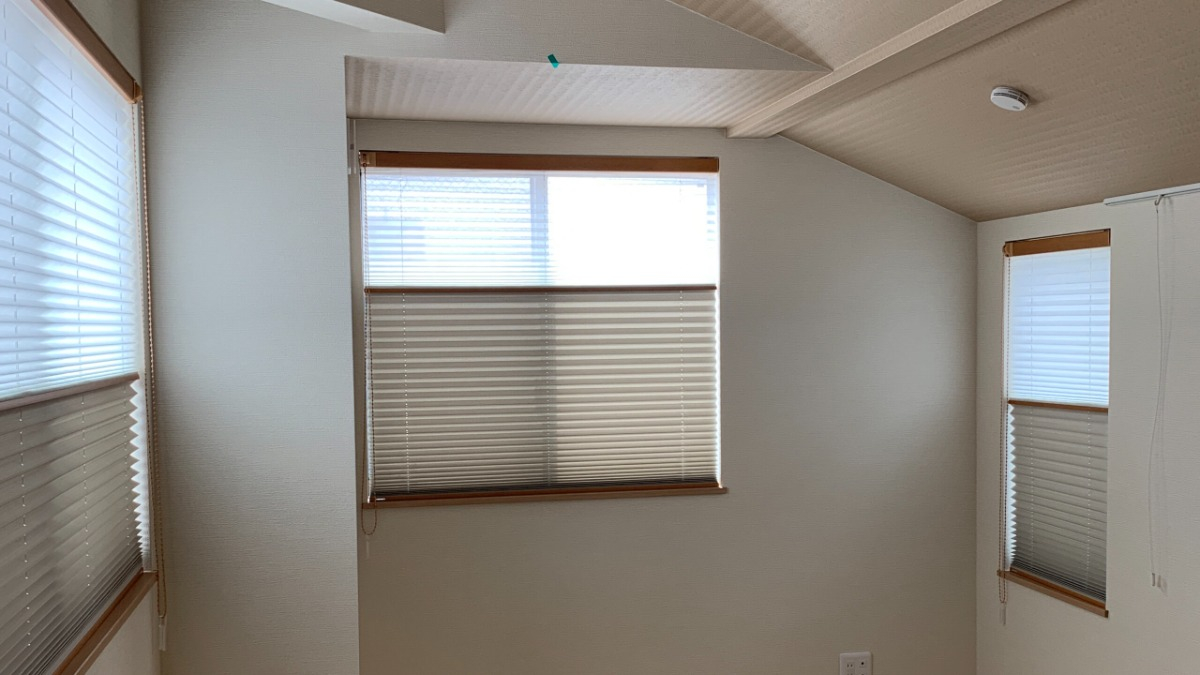 琉球タタミのモダンなお茶室は、お部屋のトーンに合わせたプリーツスクリーンをお納めしました。プリーツスクリーンは上にレースを持ってくることで、お隣からの視線をカットしつつ空を望め開放的な空間になります。