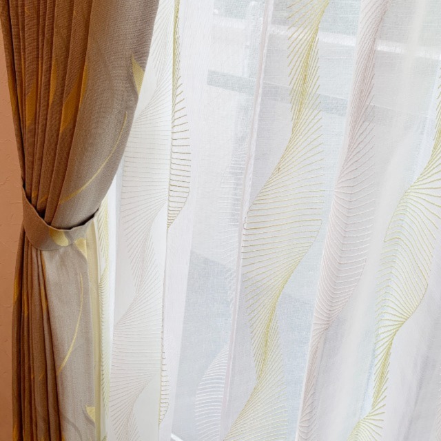 リビングは自然の有機的なイメージを抽象的なパターンで表現したファブリックでシェードに。光沢感のある糸が陽の光を受けて伸びやかに浮かび上がります。リズミカルな刺繍のデザインのレースをコーディネートさせていただきました。ダイニングは色違いのお食事が美味しくいただける温かみがあるイエローで。ダイニングセットのお色味とも合って素敵な空間が出来ました!