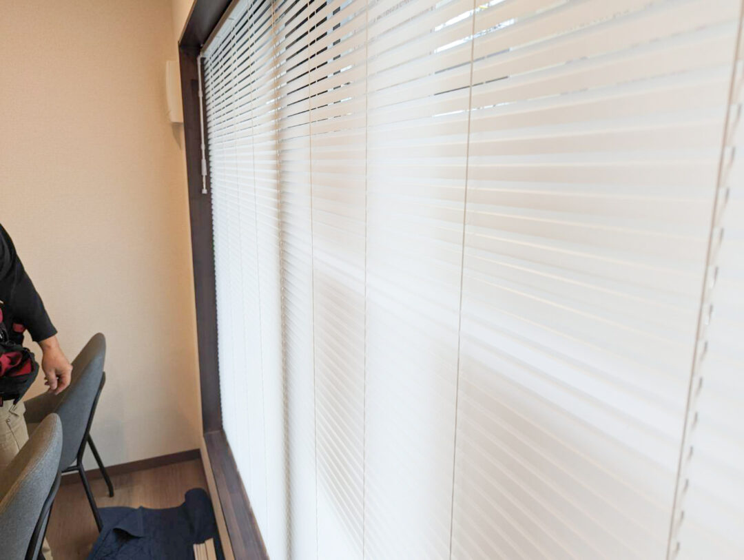 自然光を採り込み、柔らかな光に変換・拡散させる採光ブラインドをお仕立てしました。、開放的でメンタルヘルスに良い環境をつくります。