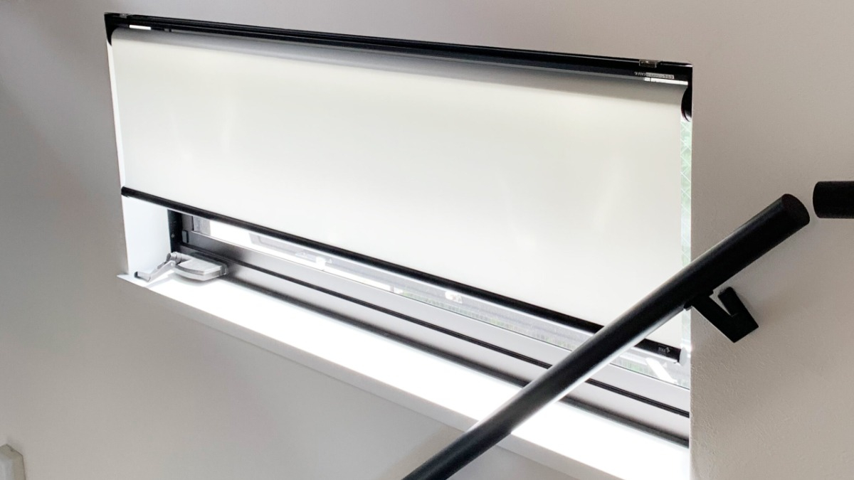 窓装飾プランナーのMです。 採光する、ガラス繊維生地のロールスクリーンを 納めさせて頂きました。 枠の中のハンドルを回避するために 逆巻き仕様にいたしました。 また、サッシの黒色に合わせて、 部品色をブラックに。スッキリとした小窓のあしらいになりました。