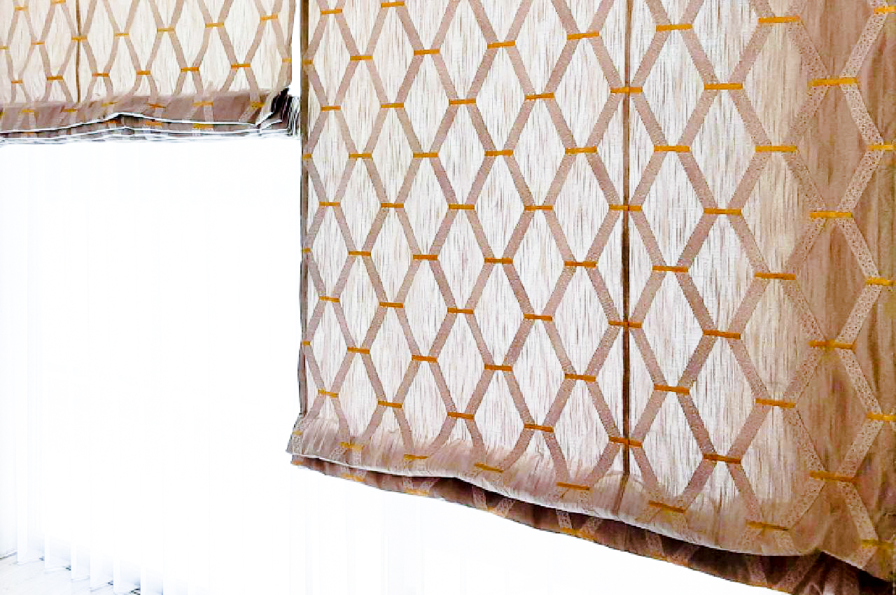サンダーソンのトレイル柄がモダンな印象のcottonにレーヨンミックスのナチュラルな生地で、プレーンシェードをお仕立てしました。