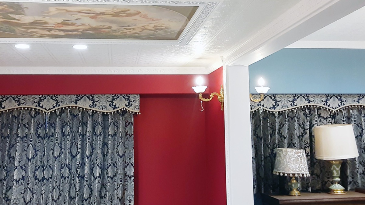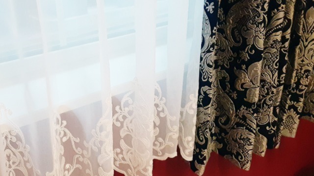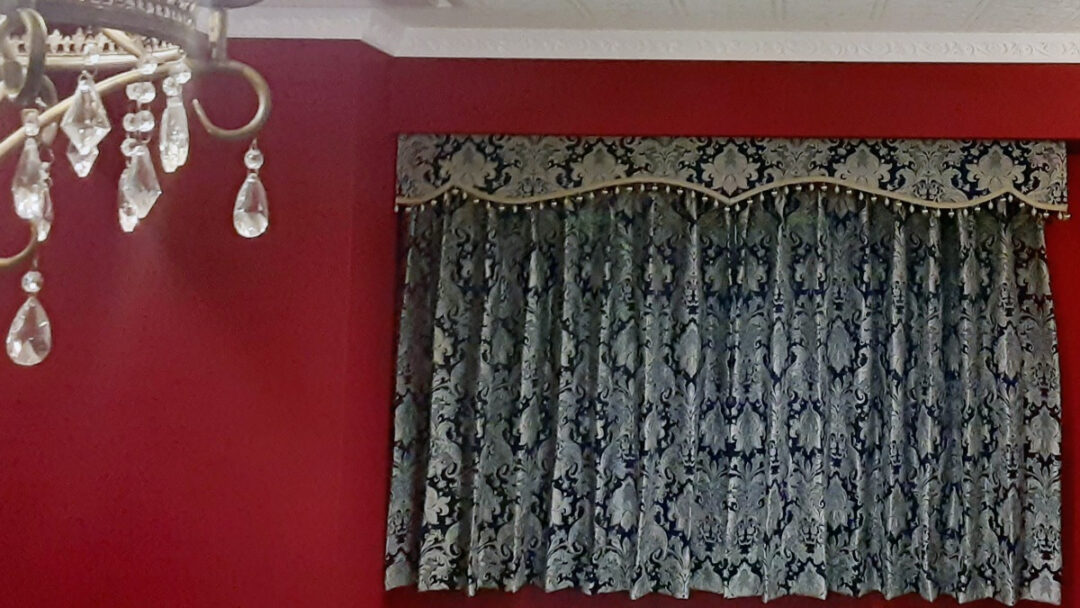 ゴージャスなインテリアに見合うように、曲線でデザインしたバランスにゴールドのトリムを付けて、家財とのバランスがとれた重厚なカーテンに仕上がりました。