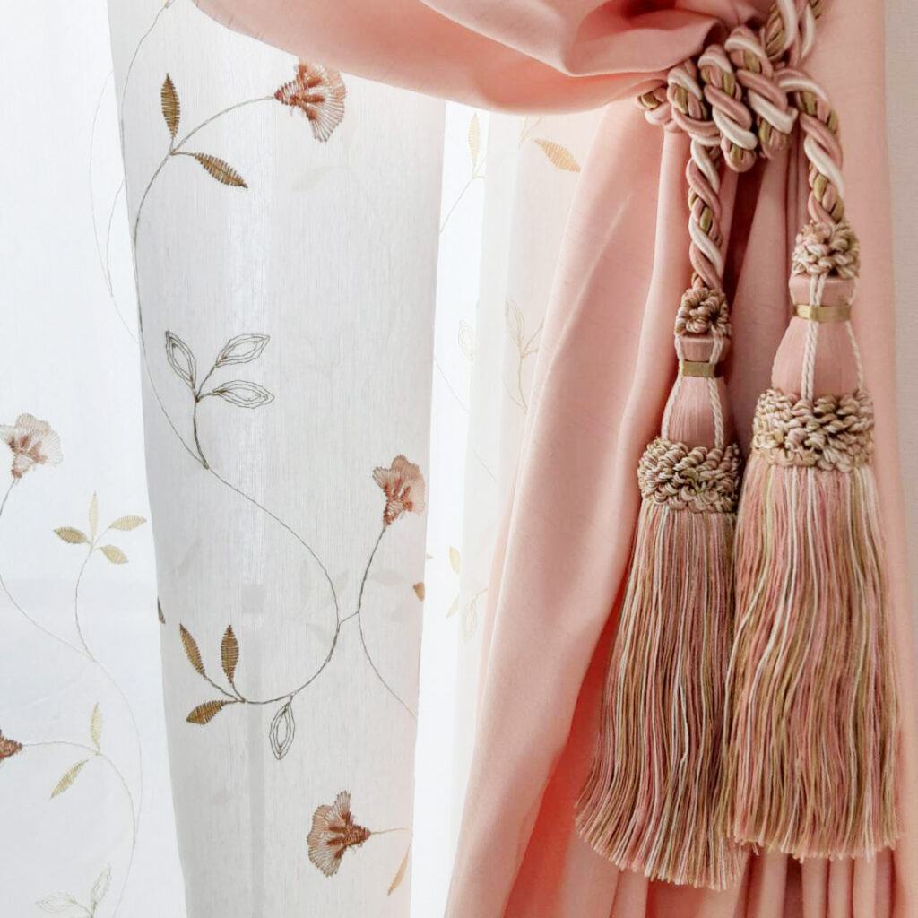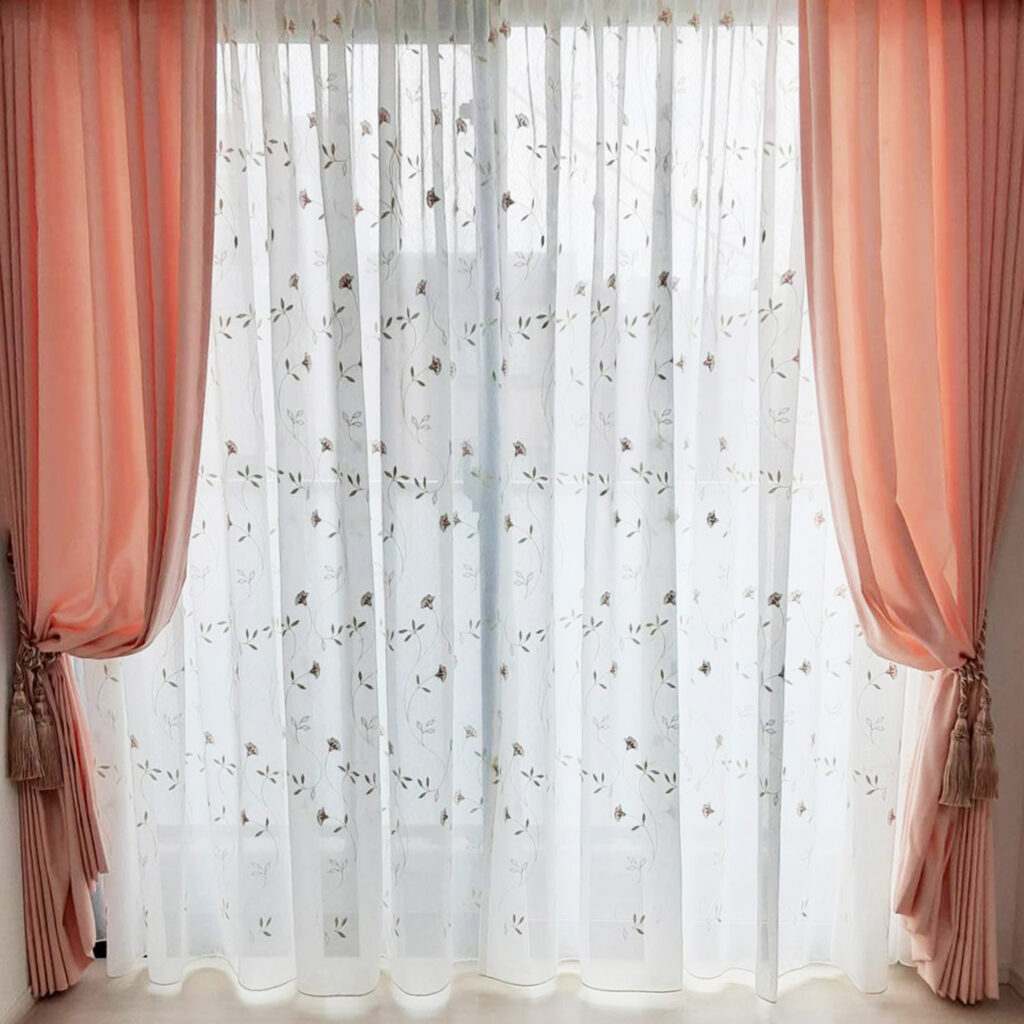 上品なピンクのドレープカーテンと繊細な刺繍のトルコのレースと合わせてお納めしました。
