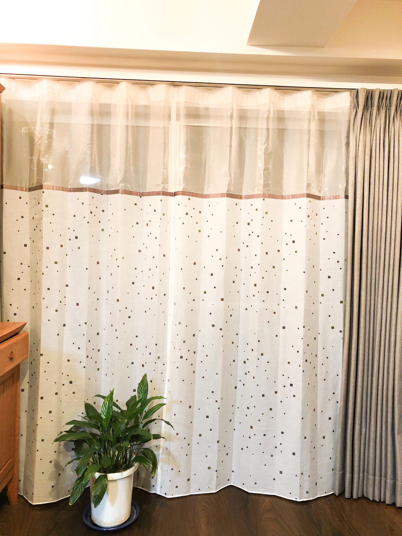今回はリビングの切替カーテンをフジエテキスタイルのキラキラという生地をメ インにして、 上部は透明感が高いフェデのバカラプレーンという生地を切替し、 外からの目線を遮りつつ空の開放感を楽しめる仕上がりになってい ます。