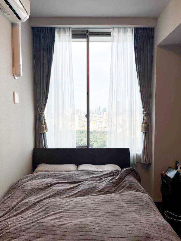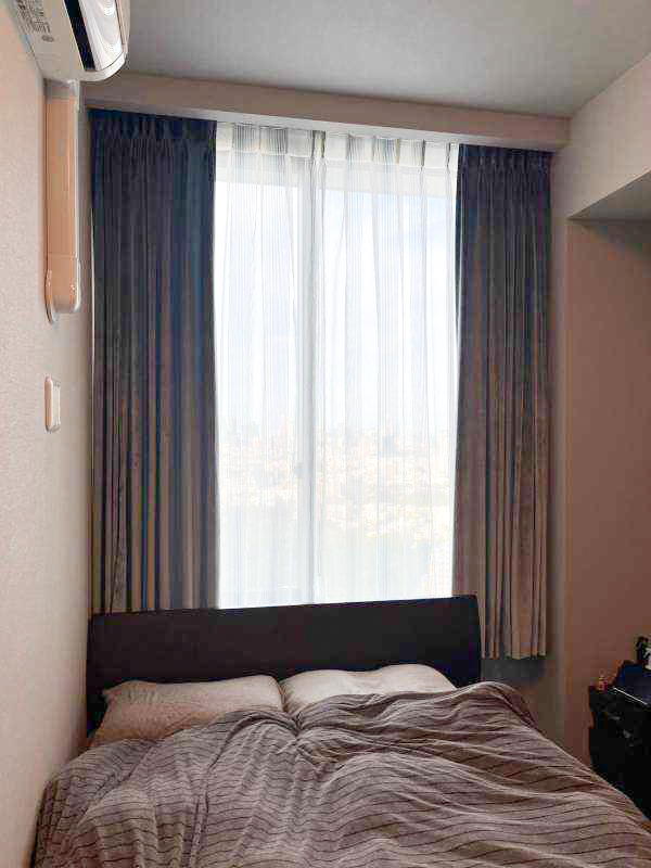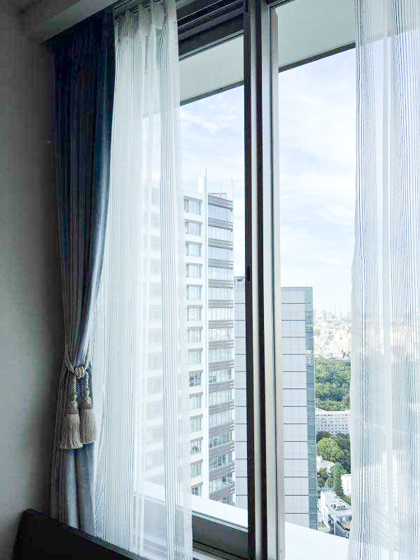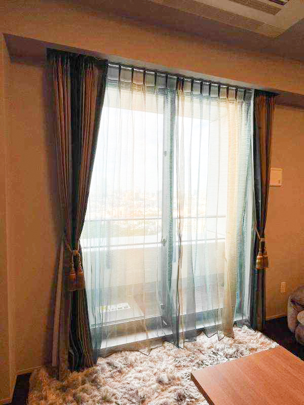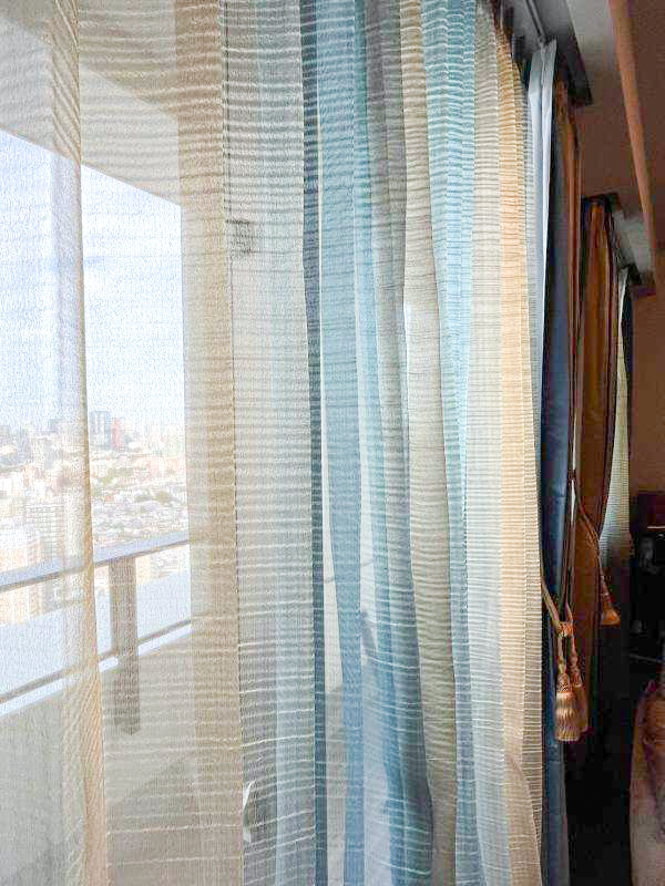 レースも同様にブルー系〜ゴールドの大きな縦ストライプのグラデーションで、ホワイトのレースよりもより透け感が望めるので、高層階の絶景眺望を活かしつつ、なんとも素敵なカーテンスタイルに仕上がりました。