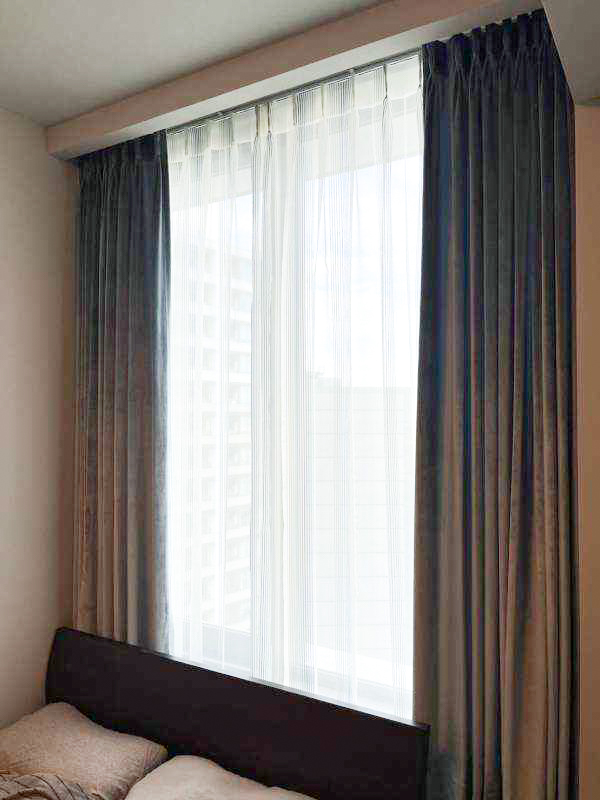 ご寝室のドレープはフィスバのベルベット、しなやかで大変美しいヴァイタスに、