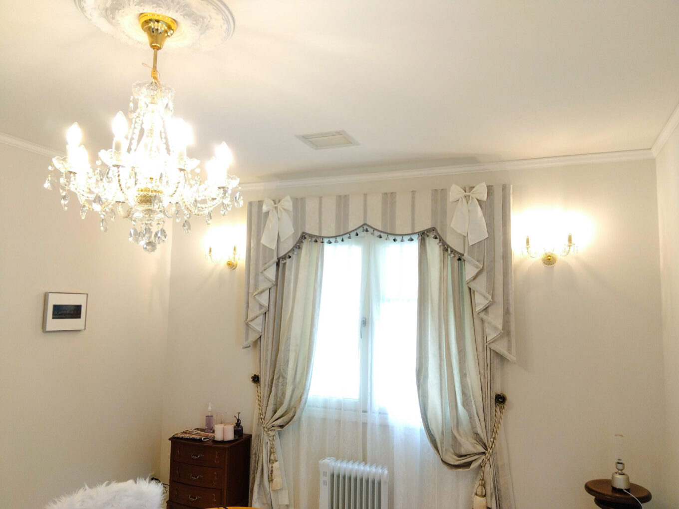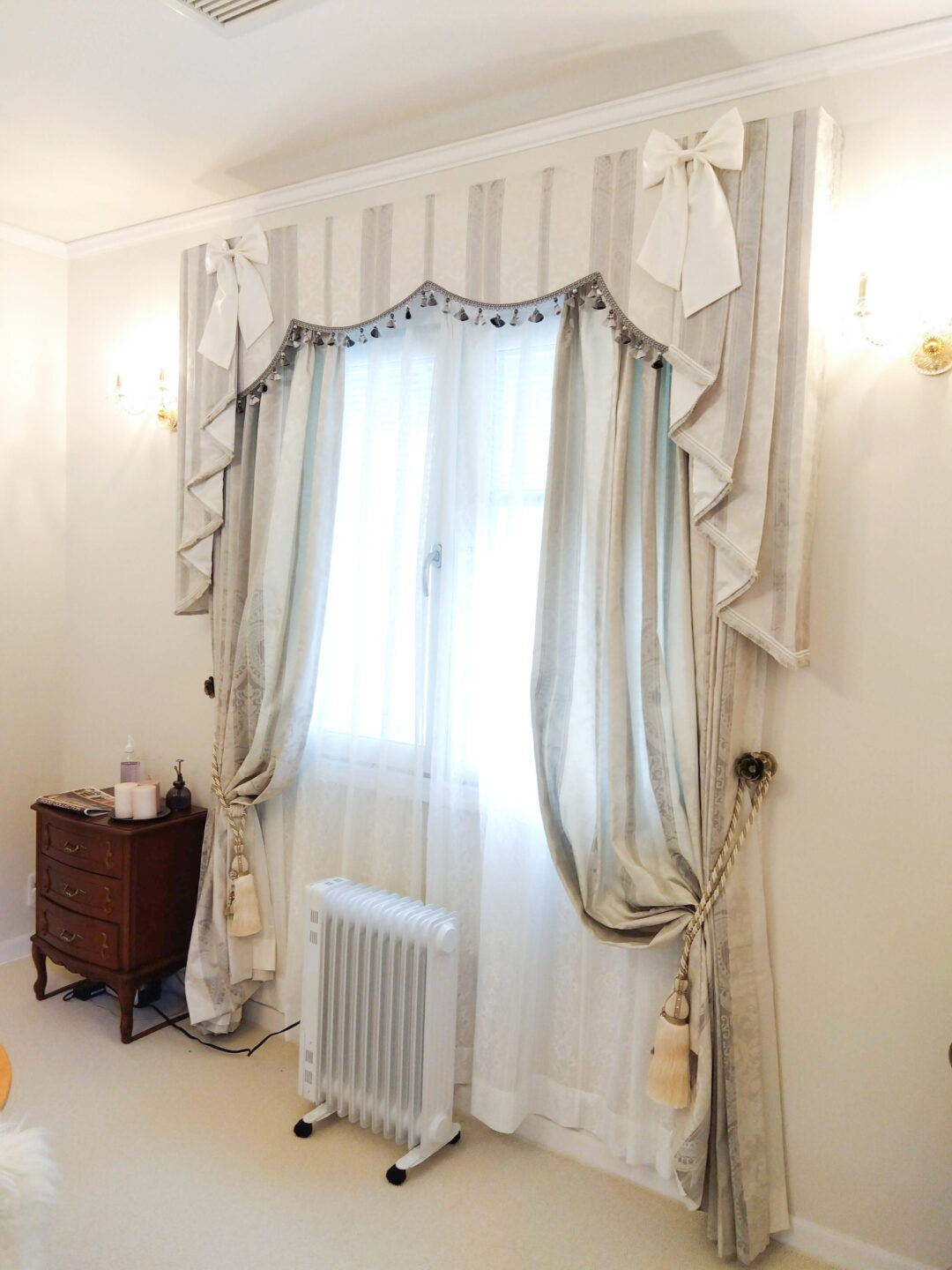 上飾り(バランス)はストレートバランスにロングカスケード付きで、図面引いてお客様のお好みの対比バランスにデザイン調整しながらじっくり計画しました。